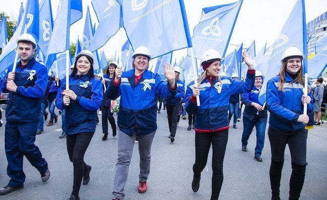 The main role in the festive parade has been undoubtedly assigned to the workers of the large petrochemical complex of Nizhnekamsk, which this year celebrates its 52nd anniversary. The premium banners are flying in the wind, and the leaders of the core enterprises are welcoming the townspeople. In the column — the representatives of the labour collective of Nizhnekamskneftekhim, which has more than 14,000 employees. More than 300 professions. One in three employees is under 35. They are followed by the teams of the subsidiaries of Nizhnekamskneftekhim.