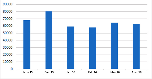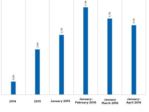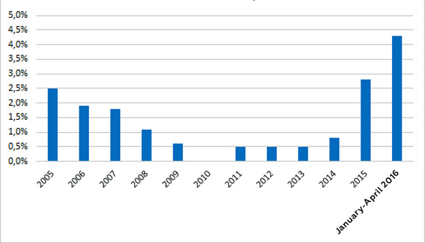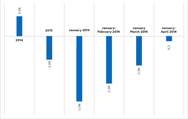 Even low oil prices (given their terribly low level in January 2016) could not stop the growth of the industry: average price of Russian oil Urals in January-April 2016 decreased by 37.5% and accounted to $33.93 per barrel. In January-April 2015 the average price of oil Urals was only $54,30 per barrel. Its nearly 40% decline in world oil prices was only partially offset by the devaluation: the average nominal US dollar rate for January-April 2016 grew by 21.5% in comparison to the index in 2015 and accounted to 72.53 rubles. The euro growth is almost the same (+20.7%).