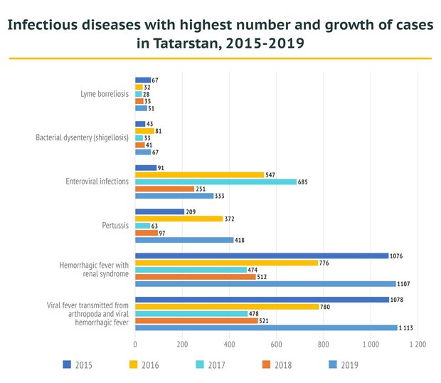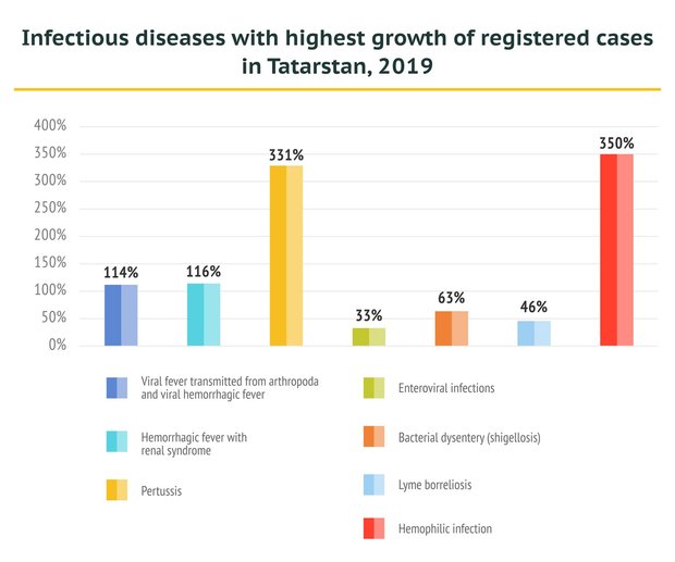 An even sharper increase in 2019 compared to the previous year was observed in the incidence of hemophilic infections — acute infectious diseases that are common mainly among children, which are caused by Bacillus influenzae. They affect the respiratory system, central nervous system and cause the appearance of suppurative focus in various organs. If in 2018 two people got sick with hemophilic infections in Tatarstan, then in 2019 — nine. In absolute numbers — it seems to be nothing terrible, but if you evaluate the growth, you can not help but ask — why? After all, for 3 years, the infection, as they say, did not raise its head.