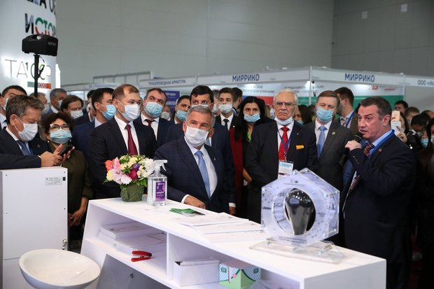 Tatarstan President Rustam Minnikhanov who approached in company with Anton Inyutsin and TAIF JSC Director General Ruslan Shigabutdinov was the first to accept the proposal. Both the federal vice minister and head Tatarstan Investment Development Agency Taliya Minullina also got a bottle of antiseptic. Everybody next to the stand exchanged impressions of the antiseptic made at NKNK.