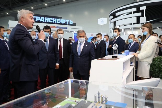 After the opening ceremony, Tatarstan President Rustam Minnikhanov accompanied by Deputy Energy Minister of Russia Anton Inyutsyn, Deputy Prime Minister of Tatarstan — Minister of Industry and Trade of Tatarstan Albert Karimov, President of the Union of Oil and Gas Producers Gennady Schmal, Director General of TAIF JSC Ruslan Shigabutdinov went to see over the exhibition stands.