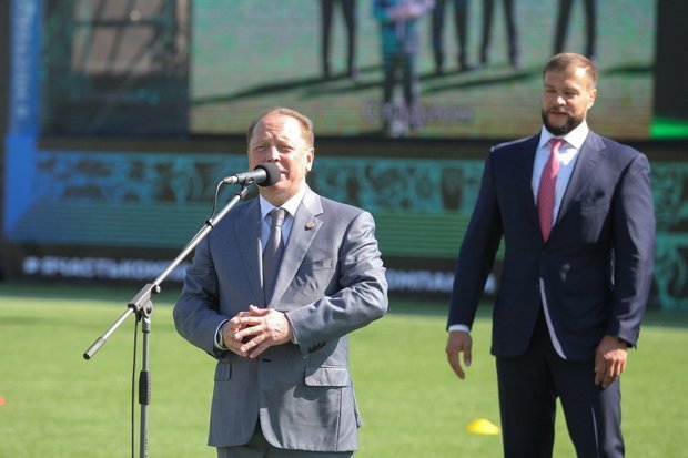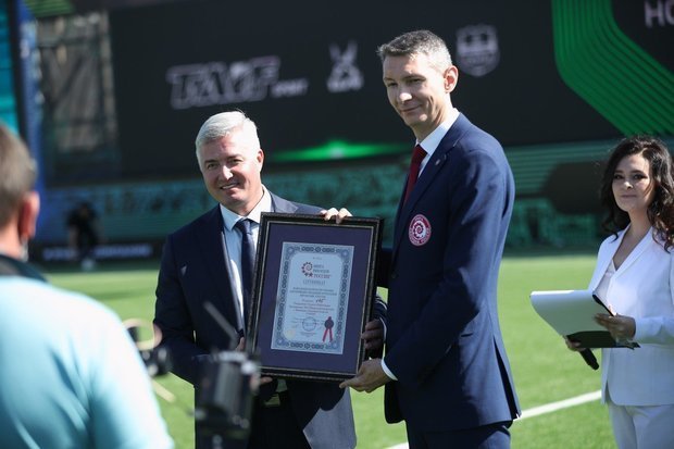 “But before the match starts," Viktor Gusev addressed the audience, “we will witness a unique event. Now before your eyes, young football players together with the legends of the clubs Neftekhimik and Spartak will set a Russian record for simultaneous juggling of the ball.