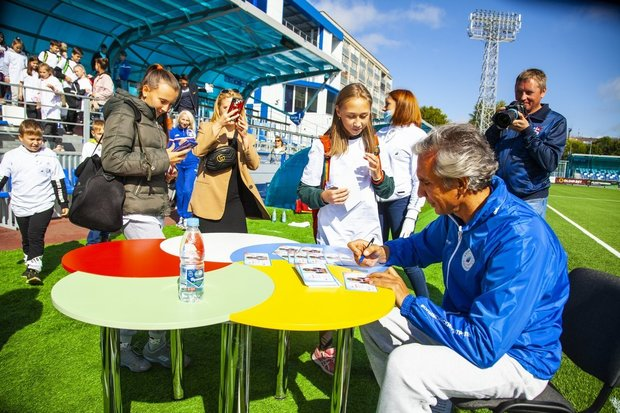 The meeting with the Olympic champions took place at Neftekhimik FC’s upgraded football stadium. Spectators — pupils of the city’s sports schools — occupied their seats in the stands long before the event began.