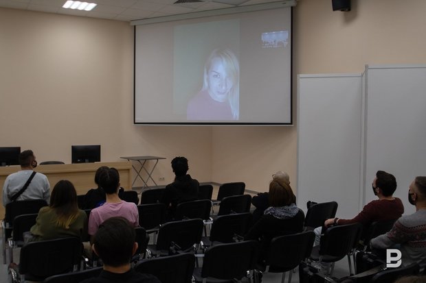 Sasha herself is being in quarantine, so at the opening she greeted the guests, and there were several dozen of them, through Zoom — also on the big screen. So the broadcast becomes part of the exhibition.