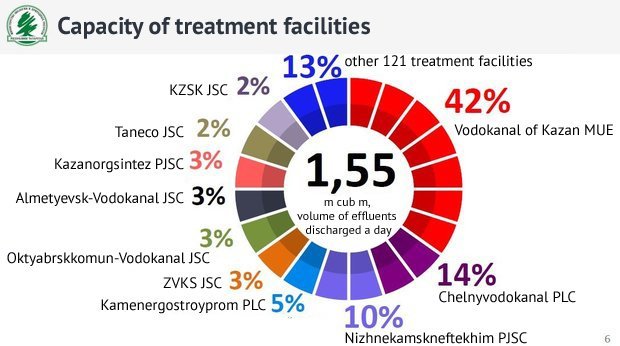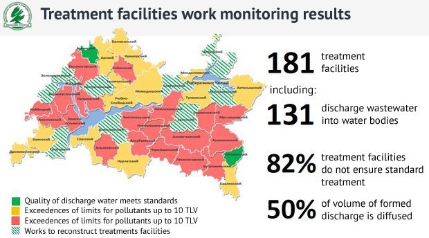 In total, 181 treatment facilities operate in the republic, of which 131 discharge water after treatment into rivers and lakes. At the same time, 82% of sewage treatment plants do not provide standard treatment. 1,55 million cubic meters of wastewater go into reservoirs a day, of which 42% is provided by one enterprise — Vodokanal of Kazan Municipal Unitary Enterprise. Another 14% is provided by Chelnyvodokanal PLC.