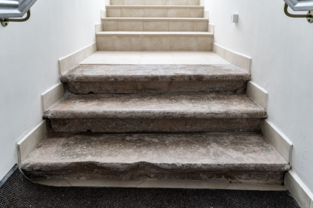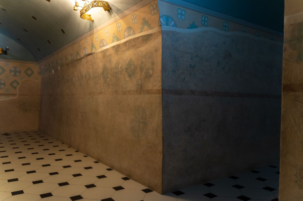 Corridors of the Cave Church have conserved the authentic wall plaster, it is visually separated from the reconstructed part with a white outline.
