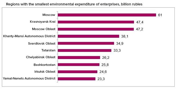 Moscow, Krasnoyarsk Krai, Moscow Oblast, Khanty-Mansi Autonomous District, Sverdlovsk Oblast, Tatarstan, Chelyabinsk Oblast, Bashkiria, Irkutsk Oblast and Yamal-Nenets Autonomous District are among the leaders in absolute environmental protection expenditure according to estimates of FinExpertiza international audit and consulting network (Realnoe Vremya has the results at its disposal).