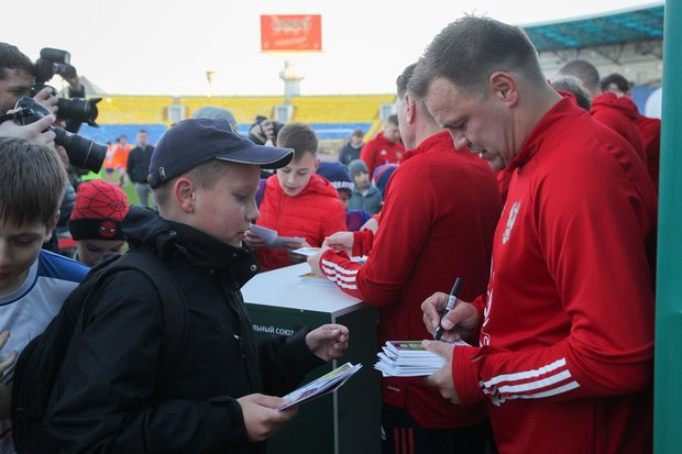 “Everything is fine. The pitch is good, soft. It is pleasant to fall on the familiar grass. We played here once. Now we are here with the football class. I think everybody got positive emotions,” Ruslan Pimenov concluded later, distracting from the autograph signing for a few seconds.