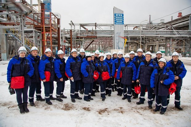 The managers took a group photo with the historical stele and headed to Plastic Plant. Here Director of the plant Ruslan Borodin welcomed them. He told them about key products. It is shock-resistant and general purpose polystyrene, ABS plastics, polypropylene, polyethylene.