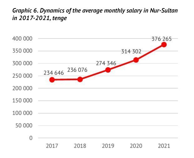 Salaries in Nur-Sultan are one of the highest in the country. The average monthly salary in 2021 was 376,265 tenge, which is approximately 67,728 rubles (as of April 2022, the Kazakh tenge against the Russian ruble was 1 to 0,18).