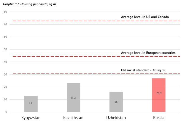 According to the UN, a person needs at least 30 square metres to live in. At this moment, this indicator is lower in the analysed countries. The levels are significantly higher than the average in European countries and in the US and Canada. The authorities of Kazakhstan, Uzbekistan and Kyrgyzstan try to improve the figure in the next years, state programmes, mortgage support, tax and economic reforms are aimed at it. More investors are attracted, including foreign ones.