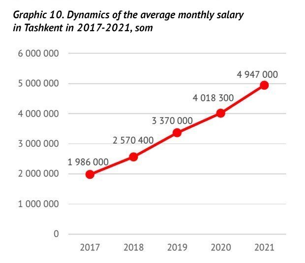The salary in Tashkent is the highest in the country. In 2021, the average monthly salary was 4,947,000 som, which is about 34,134 rubles (as of April 2022, the Uzbek som rate against the Russian ruble was 1 to 0,0069).