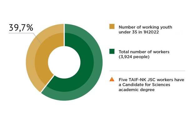 And the company has many examples of this kind, including in the management. In general TAIF-NK JSC can be certainly called a young staff. The number of working youth under 35 in the first half of 2022 is 39,7%. There are a lot of managers among them. About 4,000 top specialists work in the company in general.
