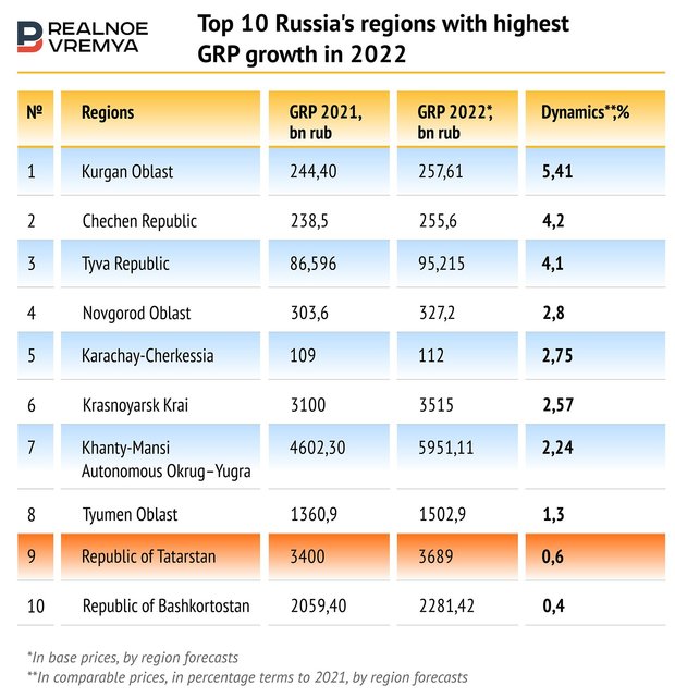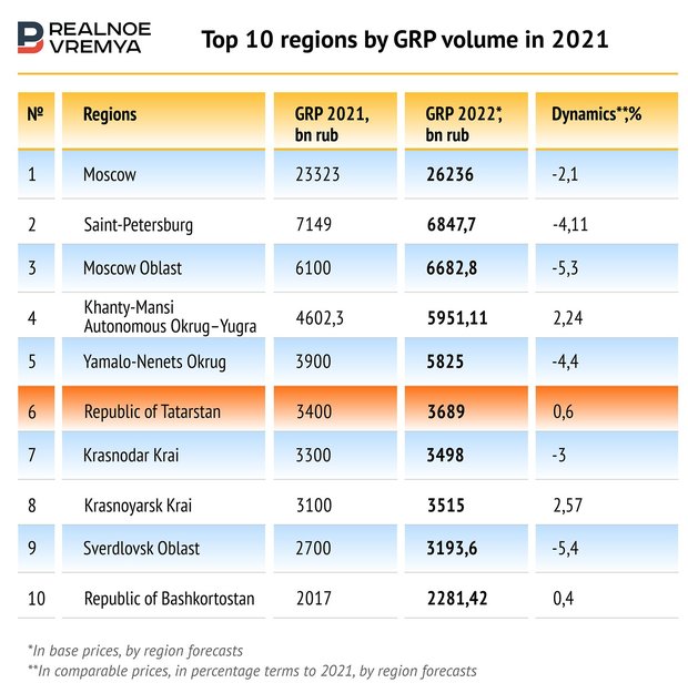 The analytical service of Realnoe Vremya analysed the forecasts of gross regional product (GRP) volumes and compiled the top 10 strongest economies of the country on their basis, as well as on the basis of open data.
