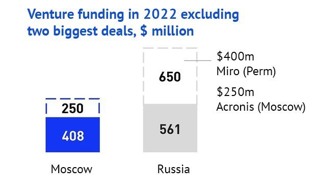 Excluding January deals with Miro and Acronics, which announced their exit from Russia in February, Russia’s venture market in 2022 was just $561 million, that of Moscow was $408 million.