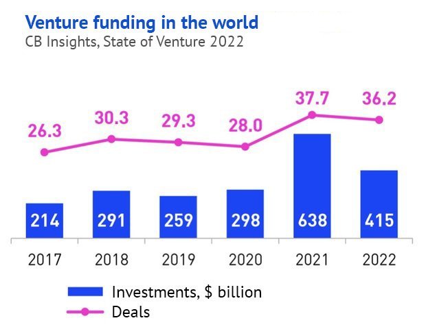 However, trying to restrain inflation in the USA last March, the FRS started to raise the rate that reached 4.25-2.5% a year — the highest since 2017. Private investors’ appetite for start-ups suddenly decreased but still top numbers of 2020.