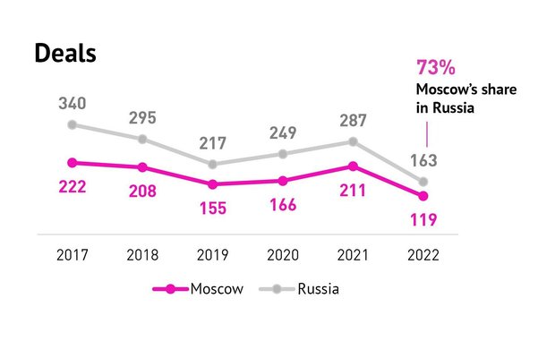 Last year the venture market decreased around the world, however, the scale of the squeeze in Russia significantly exceeds general global indicators because of economic conditions caused by sanctions. The number of venture deals reached a record low since 2017, reported Moscow’s Agency of Innovations: 163 deals were signed in Russia, of which 119 were Moscow start-ups.