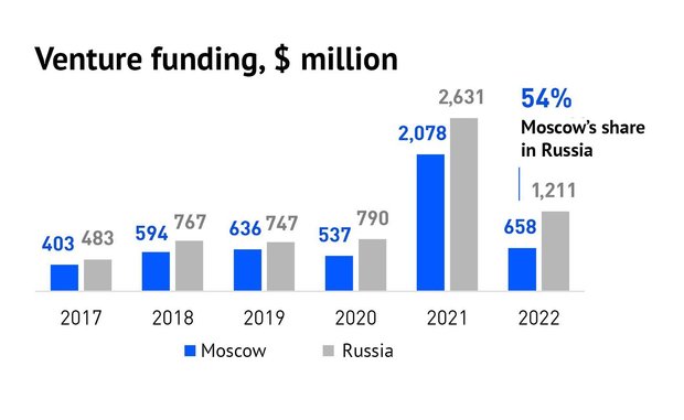 Despite the unprecedented decline, 2022 became the second in number of venture funding in Russia after 2021. The amount reduced to $1.2 billion, but this is why more than in 2020. Russia’s venture market blossomed in 2021, start-ups were literally showered with Western funds’ money, then the amount of venture investing in the country more than tripled — to $2.6 billion, of which 2.08 was Moscow.