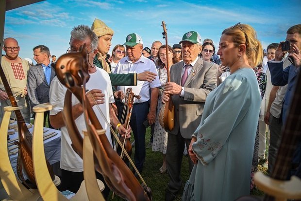 Shaimiev stopped especially for a long time at the stand with ancient Tatar national instruments — dombra, kyl-kubyz and others, the restoration of which was undertaken by the Vildanov family workshop, and at the stand with the products of Chuvash masters. He noticed that the bath in Chuvash sounds the same as in Tatar — “muncha”.
