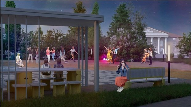 - The “youth” zone is an area adjacent to the central October Square with the House of Culture, which includes several functions: a dance stage and a platform in front of it; coworking pavilions with tables where one can work in the summer and conduct workshops, conversational meetings; a place for seasonal fairs and a children's area with a children's equipment, a children's bike path and a bathroom.