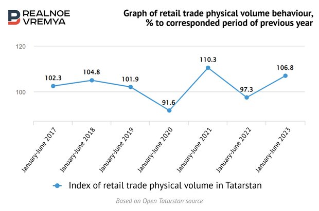 The volume of retail trade turnover in Tatarstan in the first half of 2023 reached 635,6 billion rubles. It grew in comparable prices by 6,8%. A year earlier, due to the mass withdrawal of international companies from the Russian market, retail showed a drop of 2,2%, including non-food one — 5,2%.
