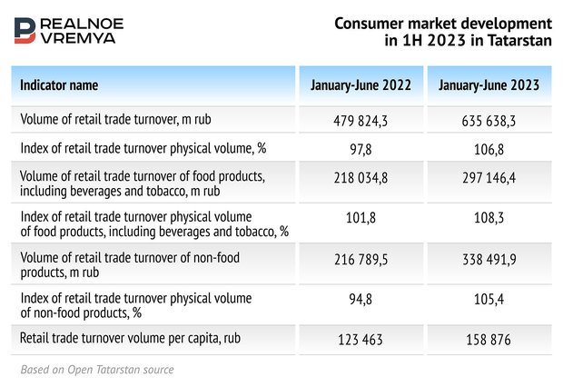 The retail market has “digested” the sanctions and feels much better than in the first half of 2022. Retail trade turnover in Tatarstan has increased to 635,6 billion rubles, while non-food retail, which suffered the most from sanctions last year, also showed a significant increase of 5,4%. Food retail has grown by 8,3%. Whether the market recovery will slow down the devaluation of the ruble and whether the trend for consumer savings is relevant — in the review of the analytical service of Realnoe Vremya.