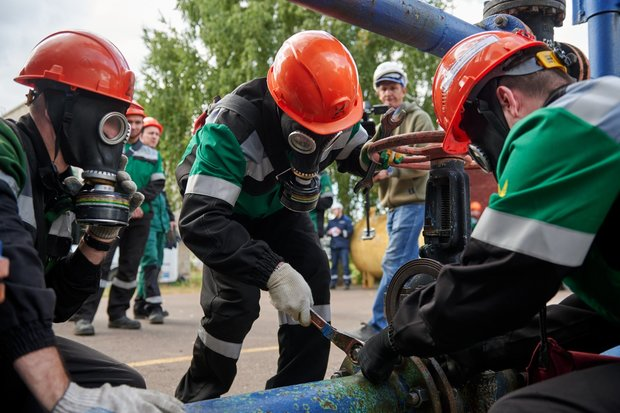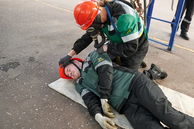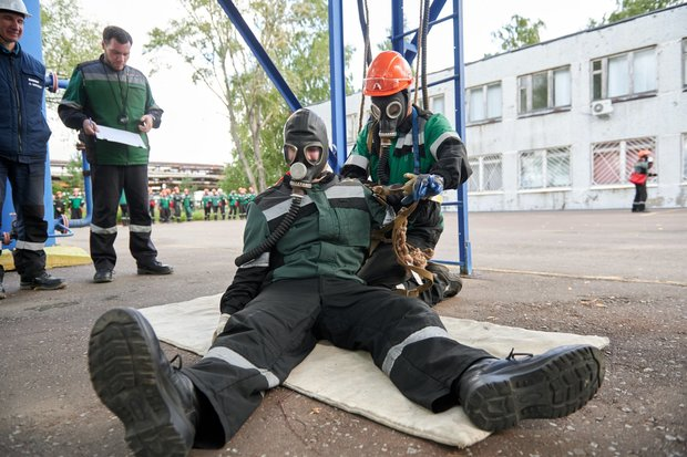 “Competitors go through three main stages and one additional one. The first one is to repack, remove and install a valve in a gas-filled zone, the second stage is to rescue a workers from a sealed space with a hose mask, the third — is to rescue and evacuate a worker from a gas-filled zone on stretchers. At the end of the trials, five teams showing the best time proceeded to test their knowledge of first aid. Two people from each team providing first aid to an injured person who was poisoned participate in the last stage,” specifies Anton Vakhotin.