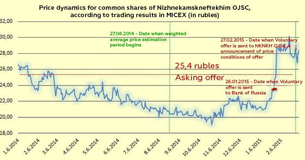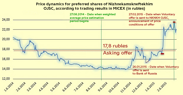 Now we switch to the price tag that Telecom-Management mentioned in its offer on securities buyout: 25,4 rubles for a common and 17,8 rubles for a preferred stock. The irony of the figures published by the mass media covering the proposal is that law again fixes the price of the offer. What is more, the algorithm of the evaluation is quite simple. The shares of NKNKH are rated in the Moscow Interbank Currency Exchange (MICEX), so, firstly, a weighted average cost of the capital in the Exchange for the last 6 months is chosen (Clause 4 of Article 84.1 of Federal Joint-Stock Companies Act). Secondly, the highest share price, at which the majority shareholder have been buying them out during the last 6 months. Then these two figures are compared, and the highest price is chosen again.