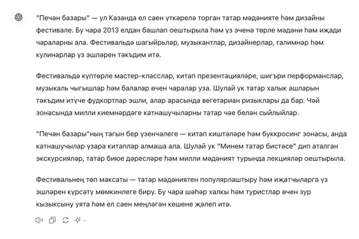 So it is a service that can answer any questions, write texts, translate texts, analyse data, generate ideas, make plans and much more. Like all normal SaaS solutions, it has free and paid versions. The free one only works with the GPT-3.5 model, and the service itself is only available via VPN. But how can all this be applied to popularise the Tatar language? Let's start with the fact that GPT-4o, unlike its earlier versions, understands and writes better in the Tatar language. Therefore, it can be used to generate texts in the Tatar language.