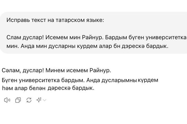 The tool can help with editing and improving existing texts, making them more coherent and readable. “As I said above, ChatGPT-4o already writes well in the Tatar language and can also find errors and correct them. In particular, by the end of this summer, the folk and I are preparing our analogue of Grammarly, which will help with working with Tatar texts,” says Khasanov.