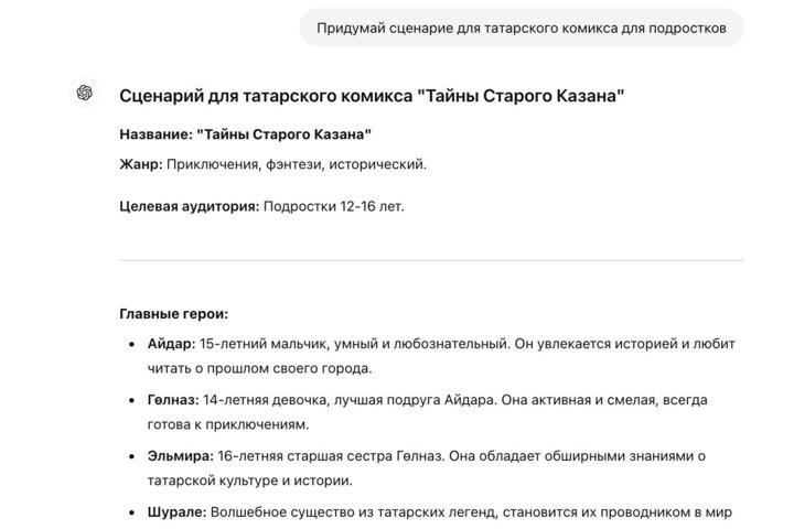 The service can create a variety of texts, including articles, stories, dialogues and scripts, which is especially useful for writers working on books and comics in the Tatar language. Let’s say you want to make a Tatar comic, the resource will help generate its idea. These same scripts can be used to create an animated film by requesting that it be divided into scenes. The tool is also suitable for generating realistic dialogues, which is useful for cartoon and comic book writers.