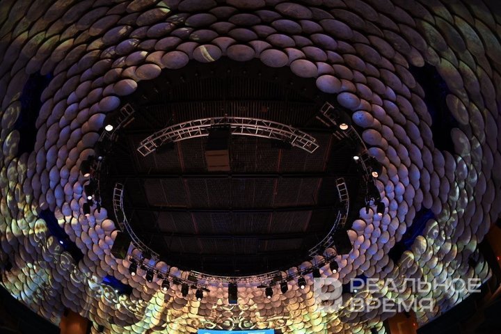 The Round Eastern Hall, the walls of which are decorated with 40-kilogramme coins, became a venue for a short concert by Kadim Almet Almetyevsk group (and outside, Leysan Gareyeva's kurai players played and Vildanovs' workshop kyl-kubyzs were demonstrated). Head of the theatre orchestra Daniyar Sokolov said that his group can be recorded in this room.