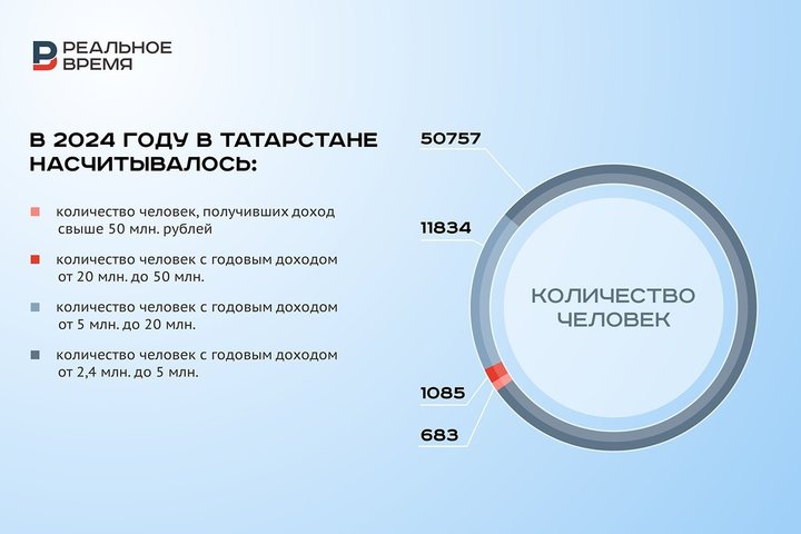 According to data from the tax service, in 2024, Tatarstan had 683 individuals earning over 50 million rubles, 1,085 individuals with annual incomes between 20 and 50 million rubles, 11,834 people earning between 5 and 20 million rubles, and 50,757 people with annual incomes ranging from 2.4 to 5 million rubles.
