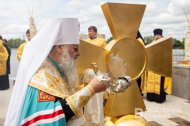 The memorial church for fallen soldiers on the Kazanka River is awaiting final touches before full restoration after a century of neglect. The renovation is expected to be completed by mid to late July. Today, Metropolitan Kirill of Kazan and Tatarstan consecrated the cross that was installed on the church.