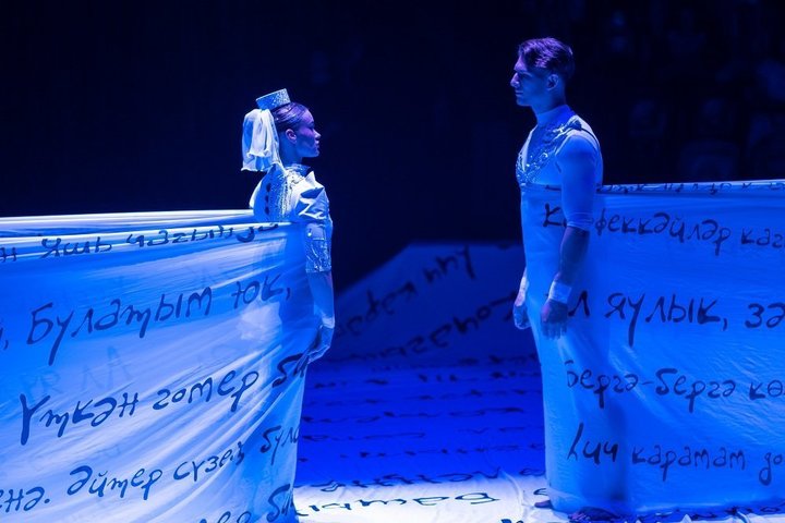 The second place of honour is held by the performance Tugan Tel by the solo equilibrist Ivan Grebenkin, who in the image of a poet rose on his hands above stacks of books, and then even higher, with the help of a stylized pen.