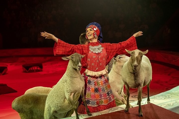 Sometimes the circus show turned into a spectacular fashion show. Artists danced in bear and fox masks, a huge bear head flew over the audience — and this was only an introduction with a trained bear under the direction of Aliya Takshantova from the Moscow Nikulin Circus on Tsvetnoy Boulevard (she sports a Turkish fez, popular among Tatars at the turn of the 19th and 20th centuries).