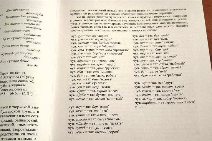 It is nice that at the very beginning the author points out the distant similarity between Chuvash and Tatar words. In general, knowledge of a language from the Turkic family will help in mastering Chuvash, which is the only representative of the Bulgar group. This helped Kuznetsov: