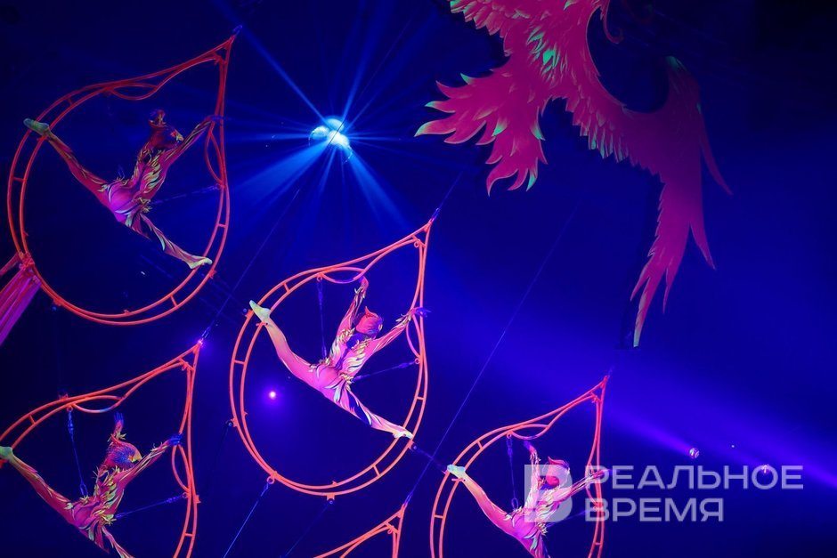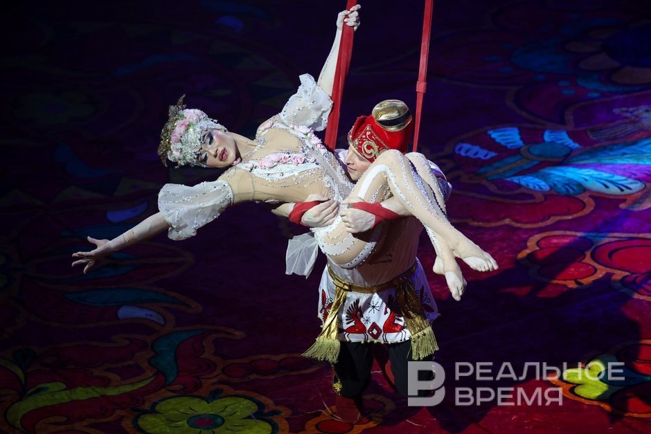 The second part of the performance also begins originally, with the theme of Month Mesyatsovich and the Sun: Kazan residents Yevgeny Petrov and Artur Yapparov climb into two wheels spinning in a circle and put on a bold acrobatic performance, jumping and running not only inside but also outside.